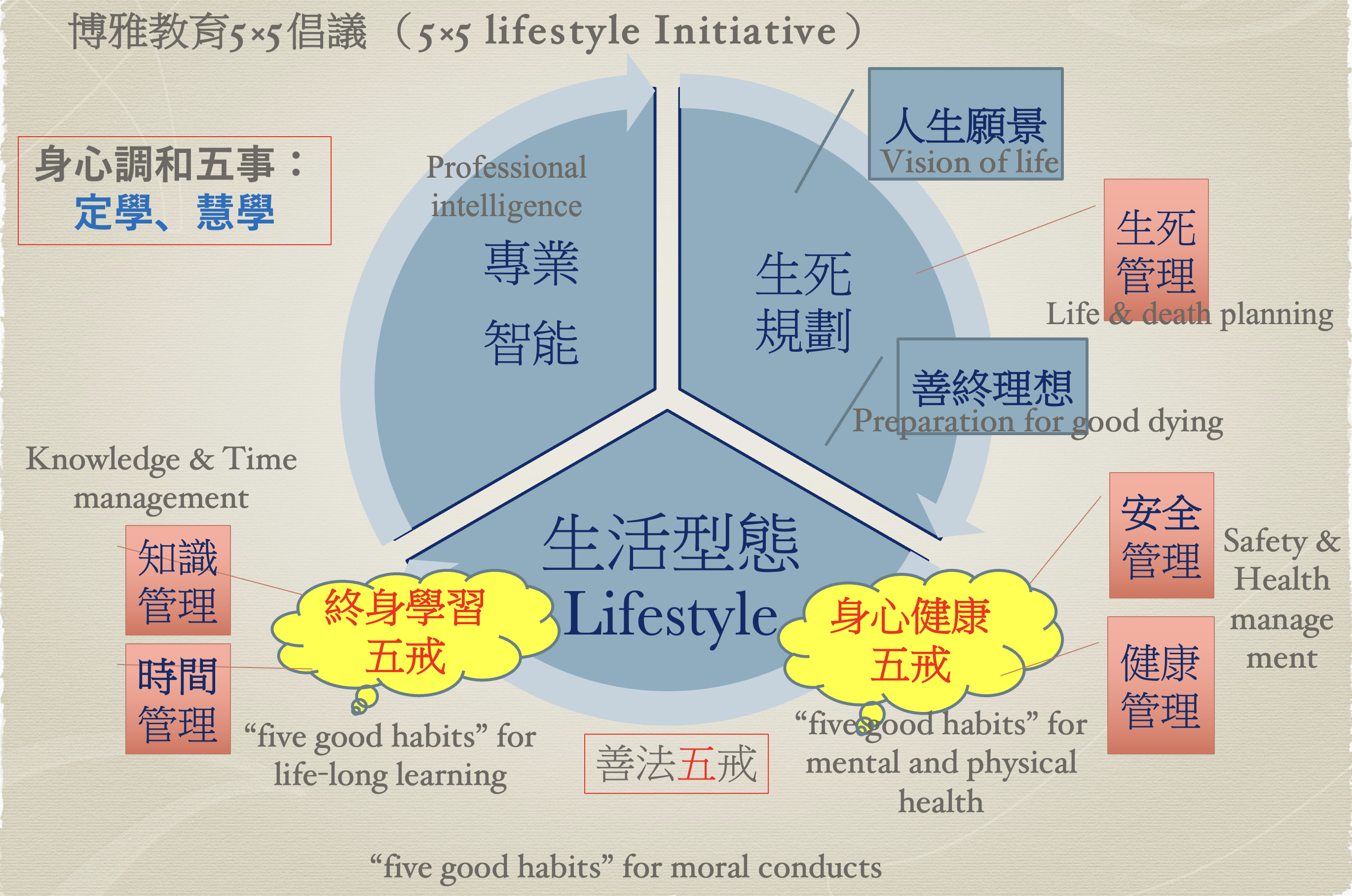 例如:推行「博學:終身學習五戒」與「雅健:身心健康五戒」之維持基本「智能、體能」如下所述之各種生活型態(Basic Life styles),可以減少個人與社會經濟負擔,並結合社區發展,提升各種社群的服務智能與體能,以及從禪修、腦科學練習「身心調和五事:身、息、念、受、想」之定慧,形塑「公民博雅文化」,增進大眾的生活品質與公民素養,這些「2種5戒、調5事之定慧」是我們提出「博雅教育5×5倡議」的緣起雛形。如下圖所示: