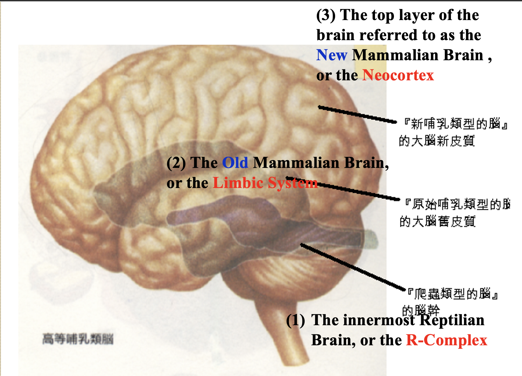 第一次讀到美國神經生理學家馬克林(Paul D. MacLean)所提倡的「三重腦理論」(1990)時,有一股很強烈的震撼直達腦海的底層,我的腦袋似乎也被震裂成三片的感覺。所謂「三重腦」是說:「人類的腦包含有最深部的『爬蟲類型的腦』的腦幹(生命中樞;掌管呼吸、心臟活動、體溫調節等維持生命功能),與約兩億年前的爬蟲類時代的演化有關。包圍腦幹的外側是『原始哺乳類型的腦』的大腦舊皮質(本能與情緒中樞,掌管食欲、性欲以及憤怒、恐懼等情感),與約一億五千萬年前原始哺乳類的演化有關。最後覆蓋其上的就是演化到靈長類才發達的『新哺乳類型的腦』的大腦新皮質(智能中樞,掌管理論性思考、判斷、說話等等高度智能活動)」。人類的胎兒的腦部也是依此三重順序發展;先後三種的演化期的腦,由內到外依序共存於人腦中。